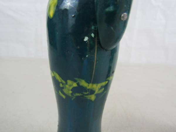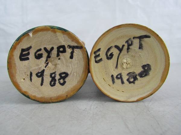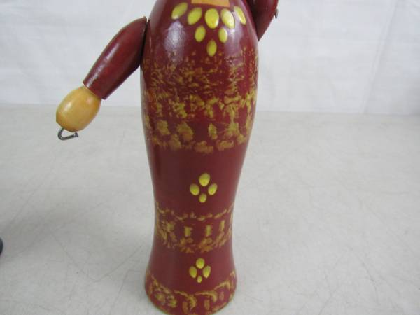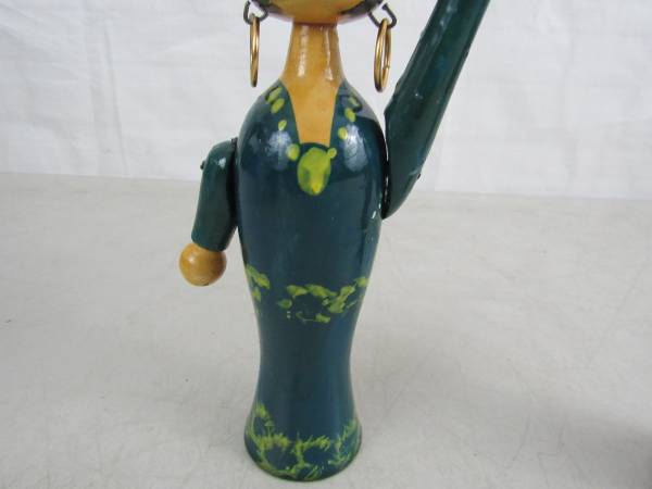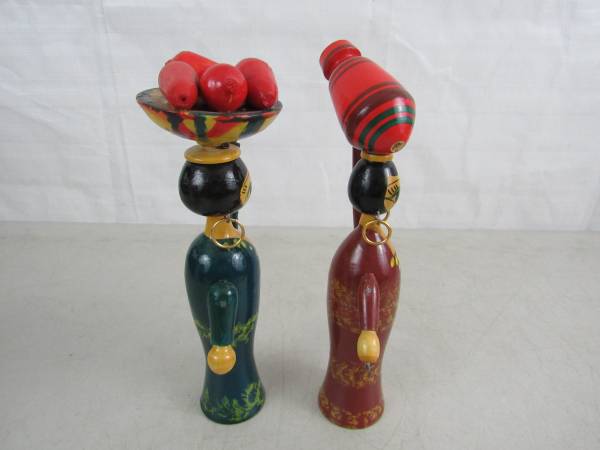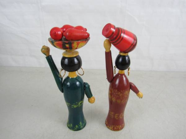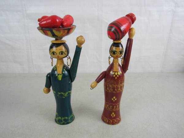 The dolls are 9 1/2" tall approximately. Hand made and hand painted. Good condition with the blue doll has a natural 2" split in the wood just below the left are pit, and also may have been holding a vase or a jug in her right hand. The doll with the large vase on her head may have also been holding a jug or a vase in right hand. Good condition with some age and usage wear.