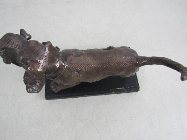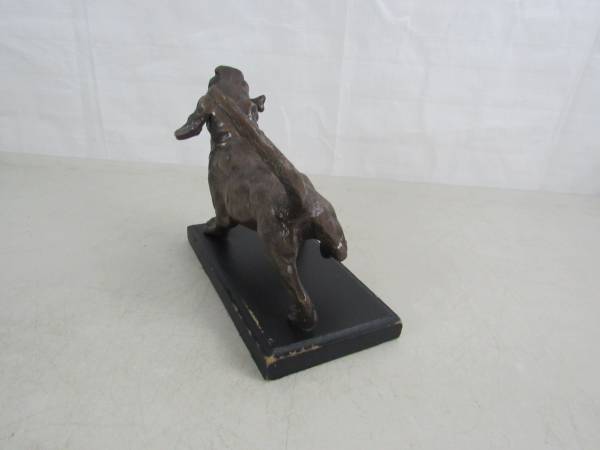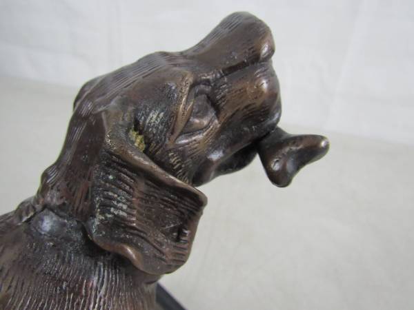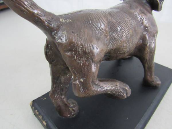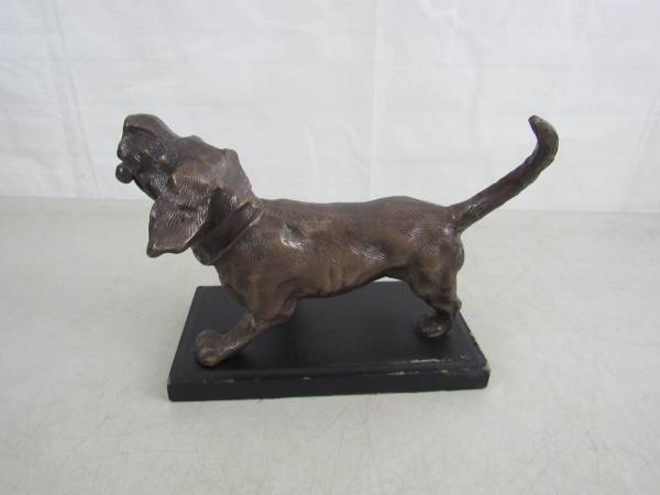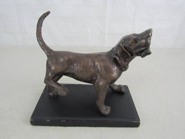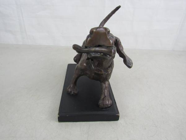 The dog statue is 8" length X 6 3/4" height at it's highest point X 4" base width, and weighs 3 pounds 5 ounces approximately. Made of die cast metal, and the base is wooden. Not sure what dog breed it is, possibly an English Pointer Good condition with some minor age and usage wear. No broken or missing parts.