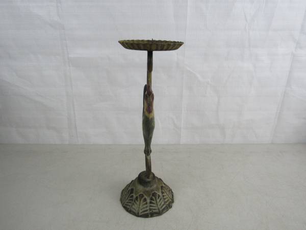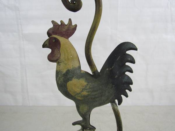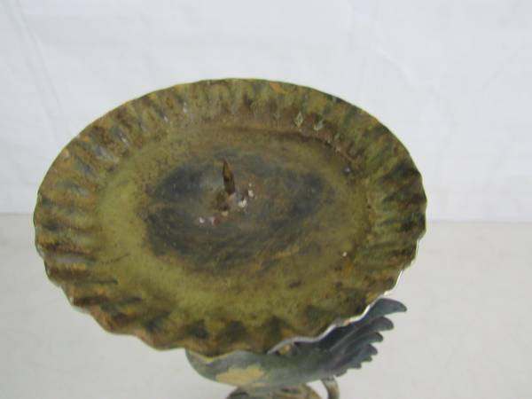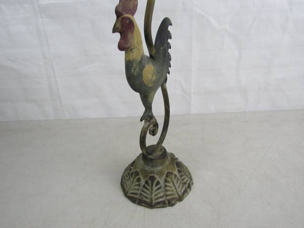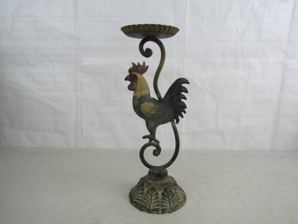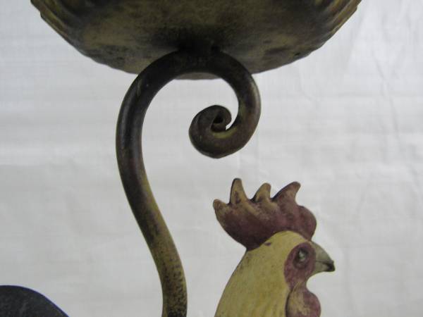 The Rooster candle holder is 12 1/2" height X 4" diameter candle wax tray holder, and weighs 2 pounds approximately. The candle stand and base are made of cast iron, The candle tray and the Roster are made of steel. Good condition with some minor age and usage wear.