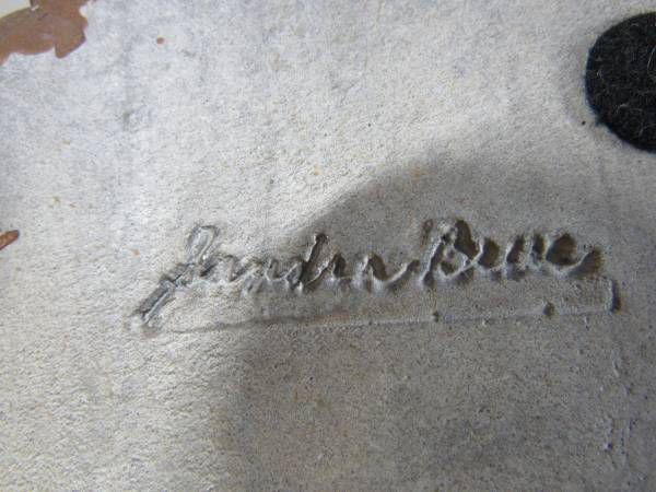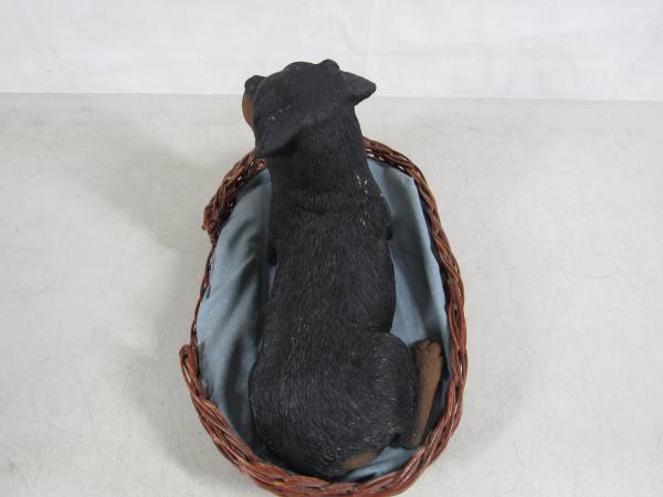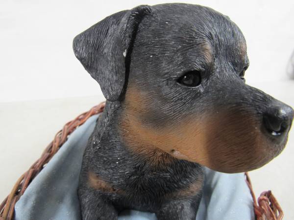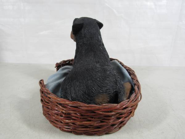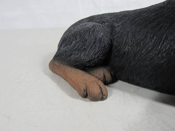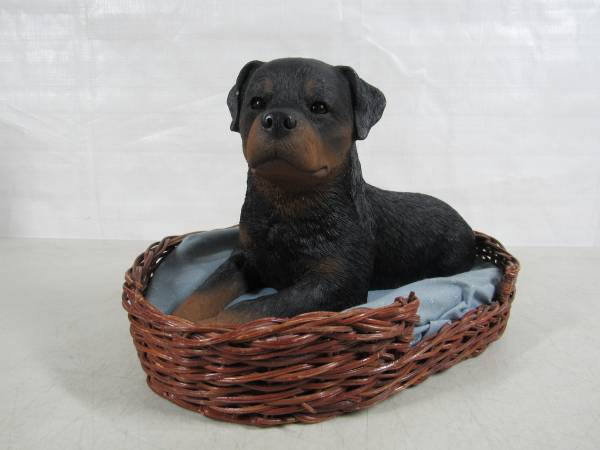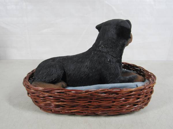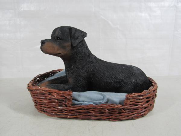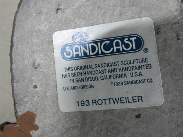 The Rottweiler Sculpture is 10" length X 5 1/2" height X 5" width at it's widest point. Made of Sandicast material, and the eyes are glass. Hand painted and weighs 4 pounds 7 ounces. Manufactured in 1986, and signed by Sandra Brue. Good condition and has some paint wear spots. The bedding was not originally included. No broken or missing parts.