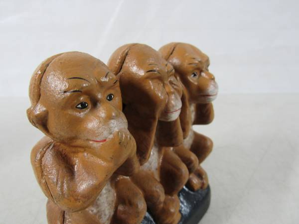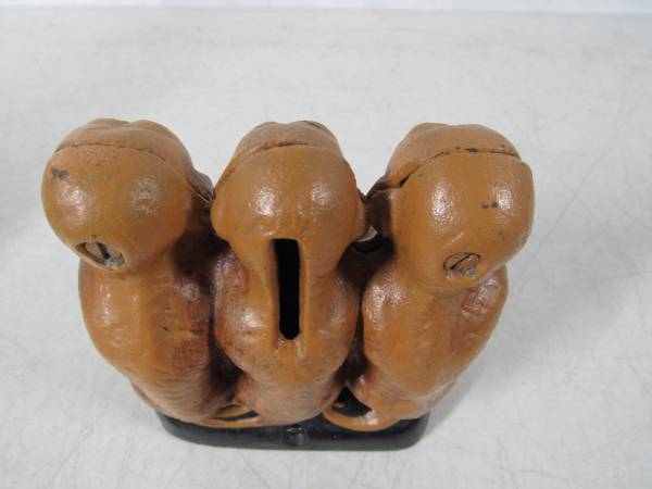 The 3 wise Monkey's coin bank is 4 1/2" width X 4 3/4" height X 2 1/2" depth. Made of cast iron, and weighs 3 pounds 9 ounces. Very good condition with some minor age and usage wear. No broken or...