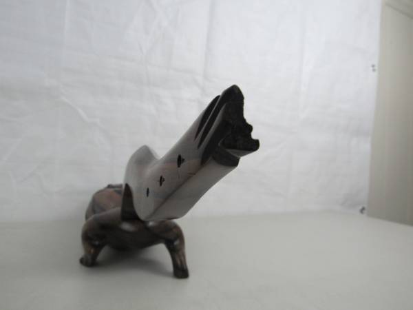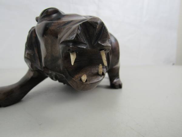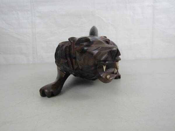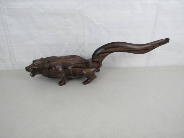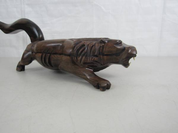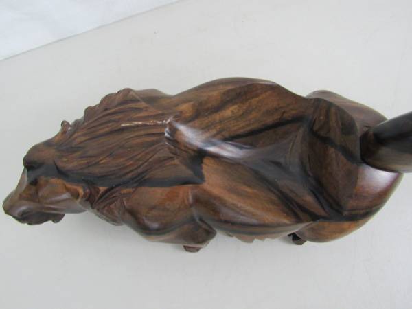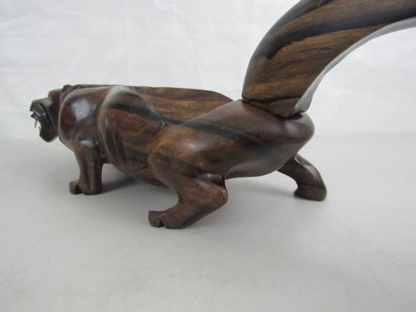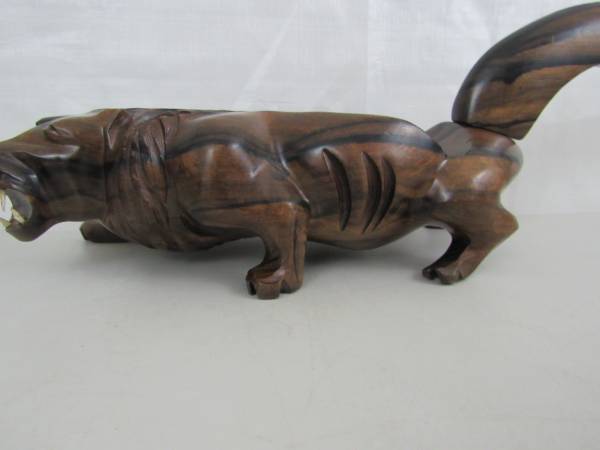 I am not sure if this is an actual Lion, but it looks close enough. It is 21 1/2" length from nose to end of tail. May have been designed as a candy dish. I am not sure why there is 3 holes at the end of the tail. Weighs just over 3 pounds, and I am not sure what type of wood possibly iron wood. Good condition with some scratches, scuffs, nicks, and finish wear. The teeth may chips, or that is the way they were carved? The tail can be removed.