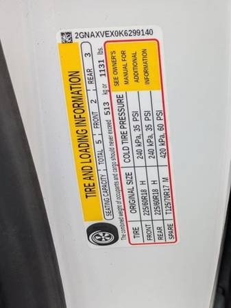 * Confidence & Convenience Package * Iridescent Pearl Tricoat * Keyless Start * License Plate Front Mounting Package * Air Conditioning; Dual-Zone Automatic Climate Control * Audio System; Chevrolet Infotainment 3 System; 7" Diagonal Color Touchscreen; AM/FM Stereo. * Axle; 3.17 Final Drive Ratio * Driver Confidence Package * Driver Convenience Package * Emissions; Connecticut; Delaware; Maine; Maryland; Massachusetts; New Jersey; New York; Oregon; Pennsylvania; Rhode Island; Vermont And Washington State Requirements * Engine; 2.0L Turbo; 4-Cylinder; Sidi; Vvt * Lane Change Alert With Side Blind Zone Alert * Liftgate; Rear Power * Lt Preferred Equipment Group * Medium Ash Gray; Premium Cloth Seat Trim * Mirrors; Outside Heated Power-Adjustable; Manual-Folding; Body-Color * Rear Cross Traffic Alert * Rear Park Assist With Audible Warning * Remote Start * Seats; Front Bucket * Seats; Heated Driver And Front Passenger * Shift Lever; Leather-Wrapped * Steering Wheel; Leather-Wrapped 3-Spoke * Tires; P225/60R18 All-Season Blackwall * Transmission; 9-Speed Automatic; Electronically-Controlled With Overdrive * Universal Home Remote * Wheels; 18" (45.7 Cm); AluminumThis vehicle includes a Money-Back Guarantee* and passed our precise inspection process. Best of all the price you see is the price you pay. No haggling. No back and forth. No pressure. And this price is so good it is guaranteed. *Money-Back Guarantee is valid for 5 days or 250 miles, whichever comes first. Subject to certain terms and conditions. See store for details. Some restrictions apply.