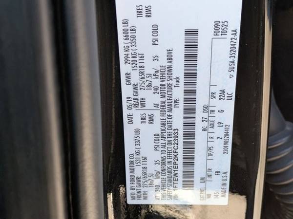 * Equipment Group 302A Luxury * Xlt Sport Appearance Package * Engine: 2.7L V6 Ecoboost * Voice-Activated Touchscreen Navigation * Xlt Power Equipment Group * Kicker Subwoofer (Dealer Installed) * Navigation System * Electronic Locking W/3.55 Axle Ratio * Reverse Sensing System * Rear Window Defroster * Remote Start System * Power Glass Heated Sideview Mirrors * Tray Style Floor Liner * Class Iv Trailer Hitch Receiver * Smoker'S Pack W/Ash Coin Cup (Dealer Installed) * Agate Black Metallic * Black; Unique Sport Cloth 40/Console/40 Front-Seats * California Emissions System * Transmission: Electronic 10-Speed AutomaticThis vehicle includes a Money-Back Guarantee* and passed our precise inspection process. Best of all the price you see is the price you pay. No haggling. No back and forth. No pressure. And this price is so good it is guaranteed. *Money-Back Guarantee is valid for 5 days or 250 miles, whichever comes first. Subject to certain terms and conditions. See store for details. Some restrictions apply.BMW of Rockville is honored to present a wonderful example of pure vehicle design... this 2019 Ford F-150 XLT only has 100,187mi on it and could potentially be the vehicle of your dreams! Indulge yourself with one of the most highly crafted, most luxurious automobiles available today. Taking the road less traveled has never been more fun than with this 4WD. With improved performance, mileage and acceleration, this 2019 4WD Ford F-150 XLT is king of the off-road. Surprising quality accompanied by a high level of performance...this Agate Black Metallic on Black Ford F-150 XLT could end up being the perfect match for you. This is about the time when you're saying it is too good to be true, and let us be the one's to tell you, it is absolutely true.