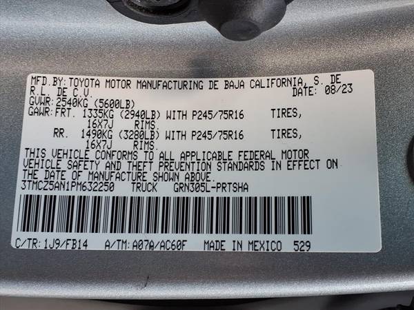 All Weather Floor Liner and Door Sill Protector., Apple CarPlay/Android Auto smart device mirroring., Toyota Safety Sense P (TSS-P) forward collision mitigation., Dynamic Radar Cruise Control (DRCC)., Cruise control with steering wheel mounted controls., Vehicle Sway Warning driver attention alert., Bluetooth wireless audio streaming., Dual-zone front climate control., Automatic High Beams (AHB) auto high-beam headlights., Bluetooth handsfree wireless device connectivity., Electronic stability control system., Manual rear child safety door locks., Heated driver and passenger side door mirrors., Gauge cluster display size: 4.20., Manual telescopic steering wheel., 16 x 7-inch front and rear silver styled steel wheels., P245/75SR16 AS BSW front and rear tires., Seat mounted side impact driver airbag., Curtain first and second-row overhead airbags., Seat mounted side impact front passenger airbag., Driver and passenger side knee airbag.,
