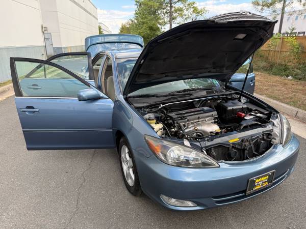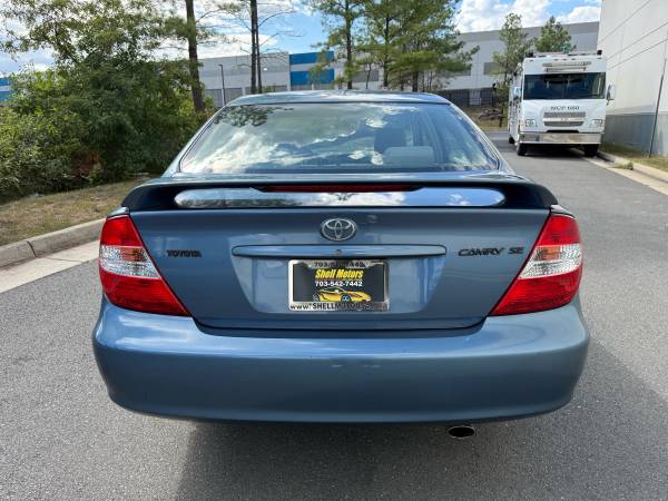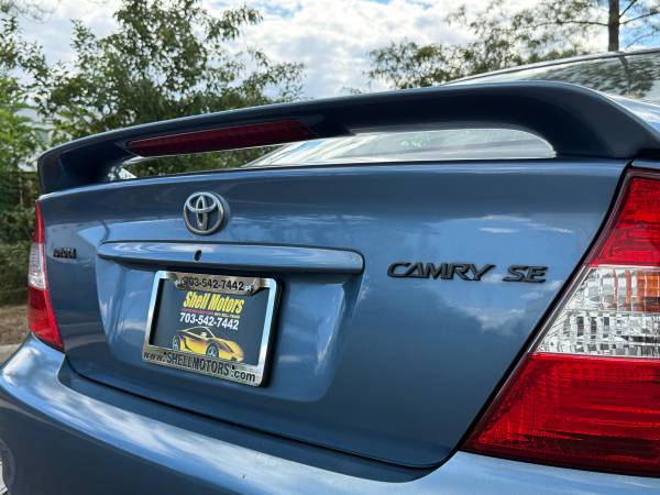 *~*Blue*~*One-Owner*~*Carfax Certified*~*VA Inspected*~*Fully Detailed*~*Serviced*~*Shell Motors of Chantilly, VA presents this 2003 Toyota Camry SE with Automatic Transmission, Power Windows, Power Door Locks, Keyless Entry, AM/FM Stereo Cd Player, Spoiler with Alloy Wheels, Sunroof, Fog Lamps, AM/FM Stereo Cd Player, A/C, Cruise Control! More info/pictures please visit our website directly @ www.shellmotors.com or just stop by for a test drive. 703-542-7442