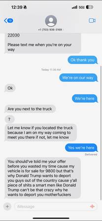 THE GUYS IS A MIDDLE EASTERN OR A GYPSY SCAMMING PEOPLE WITH THE TITLES. BECAREFUL WHEN DEALING WITH THIS AGREESIVE GUY IF YOU MAKE HIM AN OFFER DUE A LOT OF DAMAGE ON THE TRUCK HE STARTS SENDING YOU RACIST TEXT MESSAGES. HIS PHONE NUMBER IS show contact info
