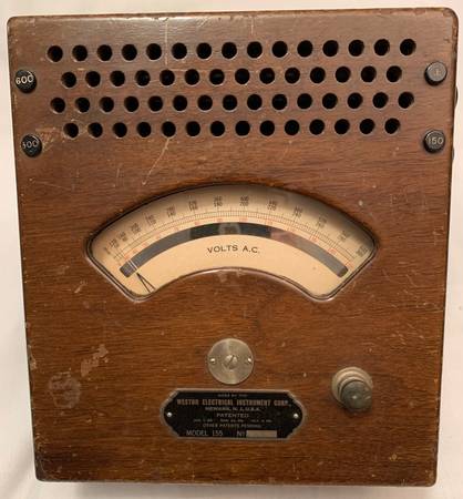 The original specs on these meters were quite impressive for the 1920s — at the time they were considered laboratory grade and specified at 0.5% accuracy. With their mirrored 150-part scales and balanced, sharp index needles, it was quite possible to take readings to at least 0.5 V resolution on the 150 V scale (would we call that a 2¾ digit instrument today? 9 bits, anyway.) . This is in great condition! A different version of the other one posted here.
