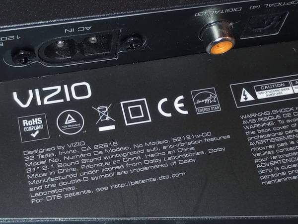 VIZIO S2121w-D0 2.1 21" Sound Bar Stand/Base for TV/Computer Monitor with Integrated Subwoofer and original remote all working and sounding great! Connections: