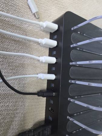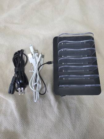 Works perfectly. 6-Port USB. I'm including 5 cables for apple and android devices. This charging station can be used with any USB connection cable like a fast charging cable. Cash, Pick-up only.