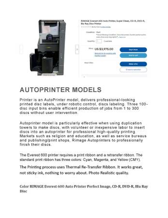 Rimage Everest 600 Thermal CD-DVD printer w/auto loader. High quality. Original owner, professionally maintained - paid over $5,000 for it new - printer and autoloader.