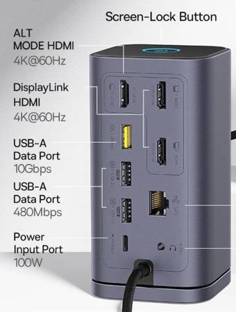 11-in-1 port expansion including HDMI, USB-C, USB-A, Ethernet, and audio