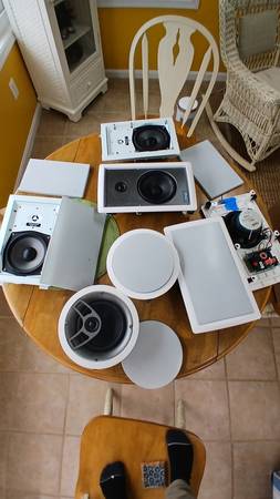 3 rectangular Polk IW65 premium in-wall speakers 2 rectangular SpeakerCraft WH6.1RT in-wall speakers 2 circular Polk IC60 premium in-ceiling speakers