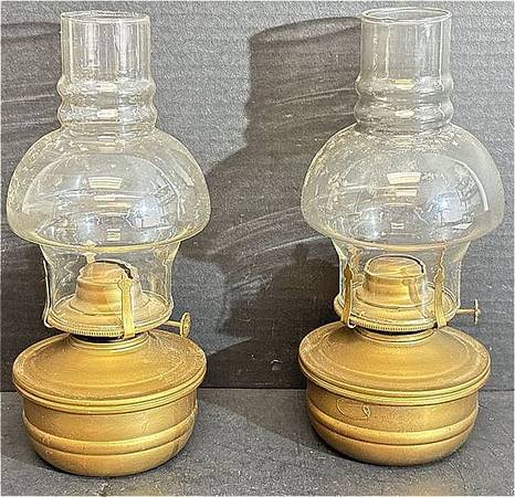 Set of 2 Vintage Lamplight Kerosene Oil Lamps: Metal Bases and Glass Shades