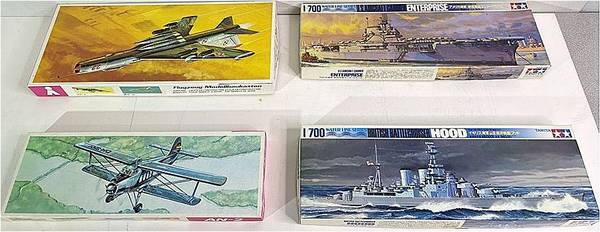 Set of 4 Unassembled Plastic Model Kits: 1:72 Su-7, 1:700 US Aircraft Carrier Enterprise, 1:700 British Battlecruiser Hood & 1:75 AN-2 - All in Original Boxes with Instructions