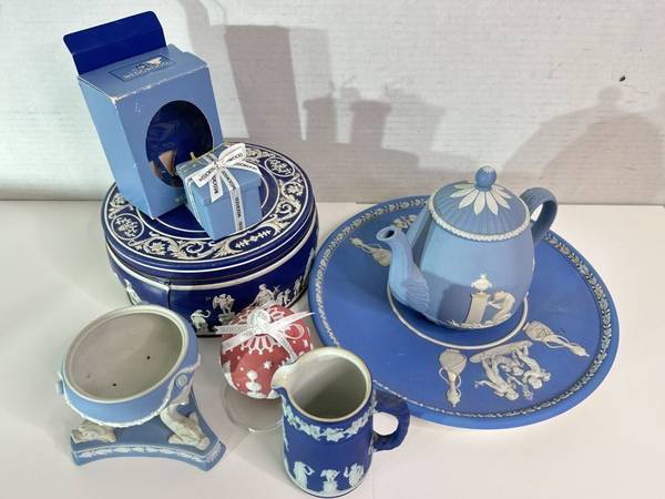 Wedgwood Jasperware Teapot, Platter, Claire Spooner Signed Gift Box, Creamer, Christmas Ornament, Pedestal Bowl & Biscuit Tin with Jasperware Style Design