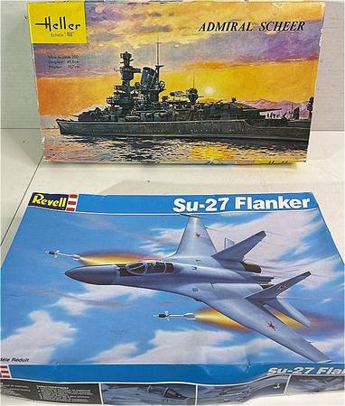 Set of 2 Unassembled Plastic Model Kits: Heller Made in France 1:400 Admiral Scheer & Revell 1:72 Su-27 Flanker - Both in Original Boxes with Instructions