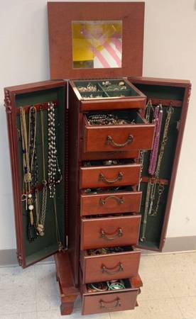 Free Standing Wooden Jewelry Armoire with Large Collection of Costume Jewelry: 14” W x 11” D x 37” H - 7 Drawers, Flip Top Mirror Opens To 2 Latch Side Doors- Doors Swing Open to Reveal Necklace Hangers