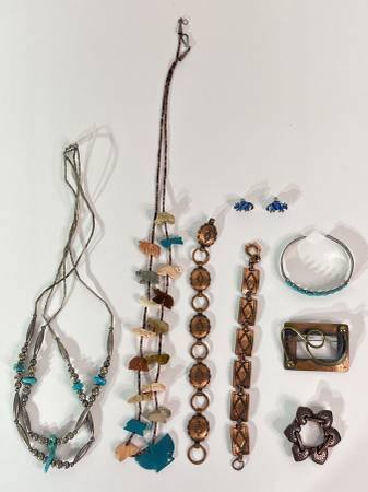 8 Piece Native American & Native American Inspired Jewelry: Fetish Necklace with Sterling Silver Clasp, Cooper Bracelets, Brooch & Scarf Clip, Armadillo Enameled Earrings & Sanford 1950’s Tourist Cuff with Faux Turquoise