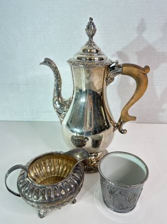 Antique/Vintage Wedgwood Silver Plate Coffee Pot, Creamer & Cup, The Cups has a Crack on the Side