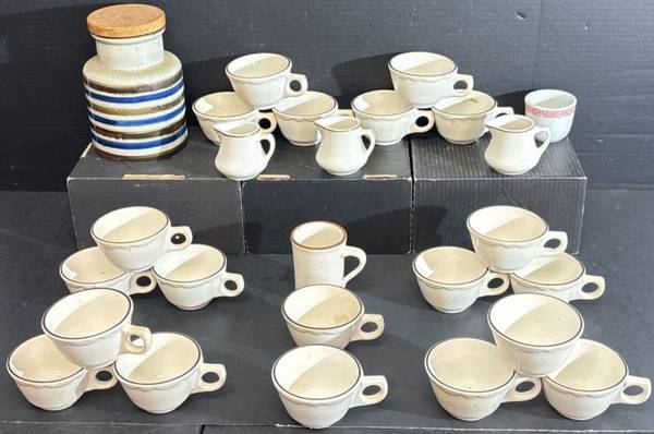 Collection of 52 Miscellaneous Vintage Dishes: 39 Are Homer Laughlin USA Bone China with Scalloped Gold Tone Rims - Round Plates & Oval Serveware, 6 Au Gratin 8” White Oval Dishes & 7 Buffalo Black China Oval Plates