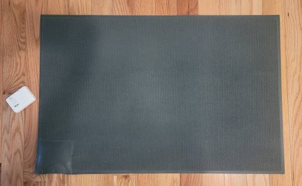 The wireless floor mat is grey and made of a high-quality, durable rubber with a non-slip surface and beveled edges that lay flat to the floor. These mats have a soft yoga mat feel but can be placed under a throw rug.