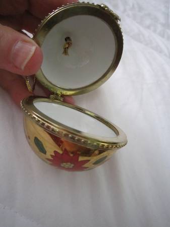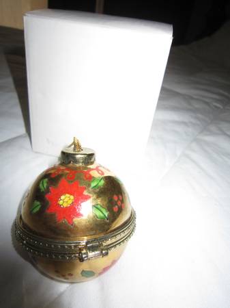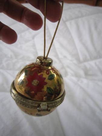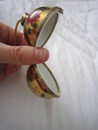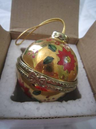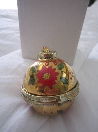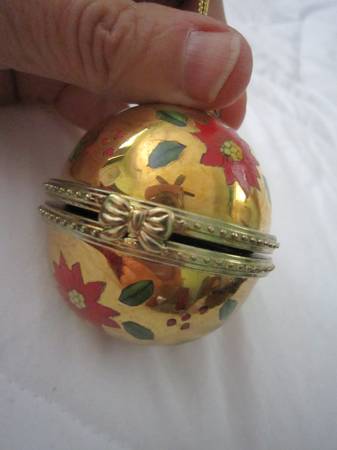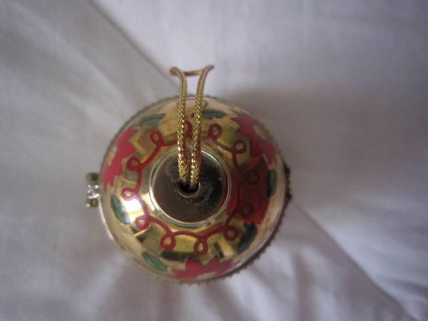 Made for Lillian Vernon, this round-shaped ornament from the early 1990’s is adorned with hand-painted poinsettias and holly. With a brass finish exterior and a white ceramic interior, it features a hinged design with a little latch shaped like a bow. You can tuck a special trinket, ring, small piece of jewelry, coins or bills, candy, etc. inside and let the gift recipient discover the surprise treat. Has a gold string for hanging on the tree or in a window. Comes with original packaging