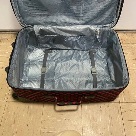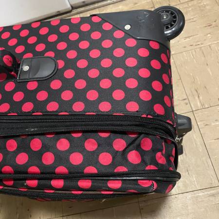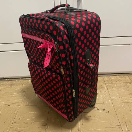 Black with Hot Neon Pink Polka Dot Luggage Checked Rolling Luggage with 2 Wheels Great pre-owned condition. Measurements: 25” Tall x 16” Wide x 12” Deep (Max Depth with Optional Extender unzipped)...