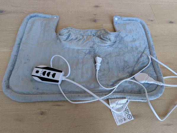 Small heated blanket for shoulders. Has a snap that secures it around your shoulders. Has a timer function. Measures about 16 x 22 inches. $2. Exact change appreciated. Let me know what time you can...