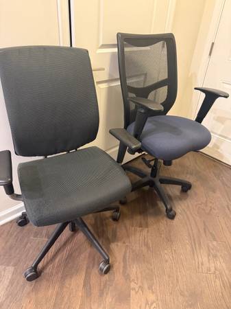 Two chairs - smooth wheel roll, the seat height is adjustable and they swivel. One has slight wear at the tip of the arm rest. $5 each Pick up in Ashburn.