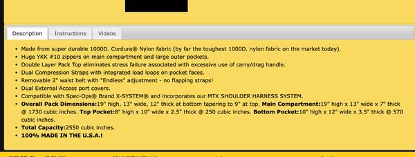 Purchased a few years ago and used for a deployment for 6 months, and hasn't been used since. Excellent build quality (made in USA) and still in new condition as far as wear and tear goes, although it has a few dirt marks on it that can be easily washed out if you wanted to put this in the washing machine, but I have never washed it. But all zippers are flawless and smooth (YKK), and there are no holes or tears anywhere on it, and the fabric is not worn down. New price is $335. This thing is a bottomless pit and expands out to hold a ton of stuff. Very comfortable to wear.