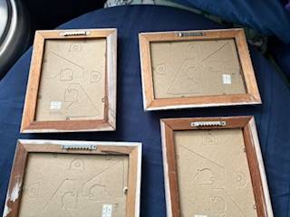 Each measures 7 inches by 9 inches. Wood frames. Ready to hang. Cute pictures.