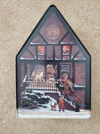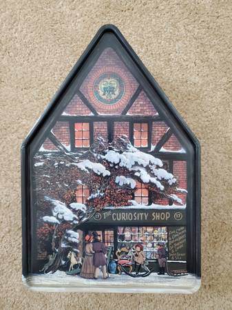 This tin features the Curiosity shop on the front and a rocking horse repair shop on the back.