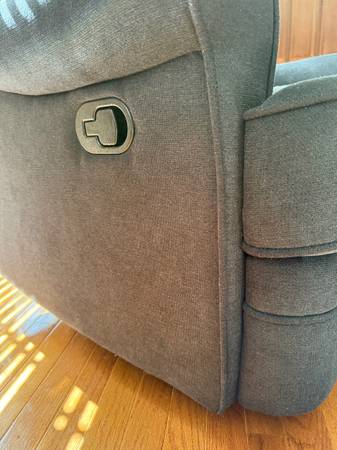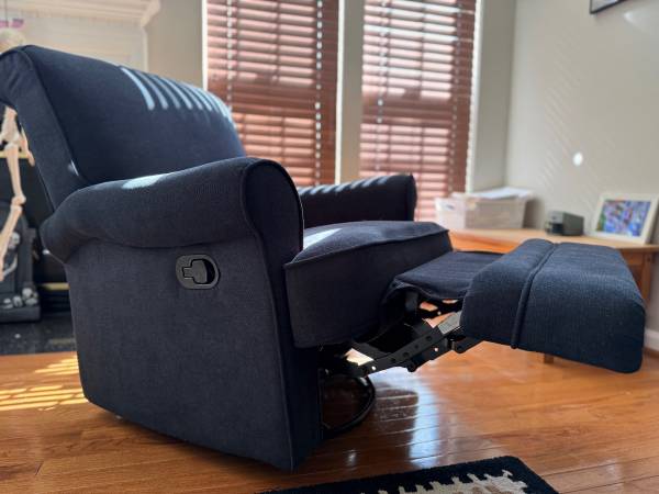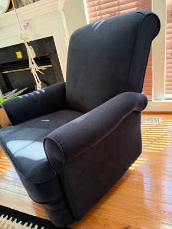 This cozy gray reclining glider chair is perfect for a nursery, reading nook, or living room. It gently glides and reclines smoothly, is comfortable and supportive. The chair is in good condition with minor fabric scratches on the backrest (shown in photo), but otherwise clean and well cared for. It’s a beautiful charcoal gray, soft fabric, and I absolutely adore it. Unfortunately I have to downsize and decided to post it for sale. I purchased it from Wayfair in 2019.