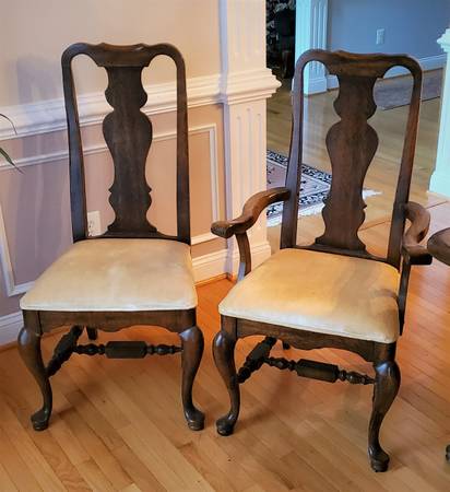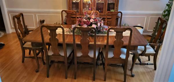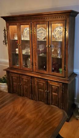 THIS SET INCLUDES THE TABLE WITH TWO 15 INCH LEAVES, THE 2 PIECE CHINA CABINET, 2 ARM CHAIRS AND 6 STANDARD CHAIRS. IT HAS AN OAK GRAIN LOOK WITH A WALNUT FINISH. THE TABLE IS 44 INCHES WIDE AND 64 INCHES LONG AND WITH THE ONE 15 INCHES LEAVES IT CAN BE 79 INCHES LONG AND WITH TWO LEAVES IT CAN BE 94 INCHES LONG. IT IS 30 INCHES TALL. THE CHINA CABINET IS 19 ½ INCHES DEEP, 66 INCHES WIDE AND 80 ½ INCHES TALL. THE TOP SECTION HAS 2 GLASS SHELVES AND 2 LIGHTS. ON ONE SIDE OF THE BOTTOM SECTION THERE ARE 3 DRAWERS AND THE OTHER SIDE IS OPEN WITH 1 SHELF.