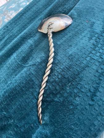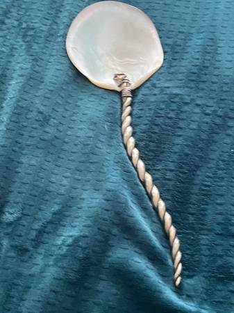 19th Century Art Nouveau hand forged silver plated barley twist serving spoon. The bowl of the spoon is a sculpted Mother of Pearl shell. In good condition with some loss in the silver plating.