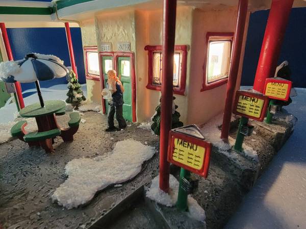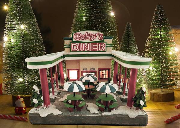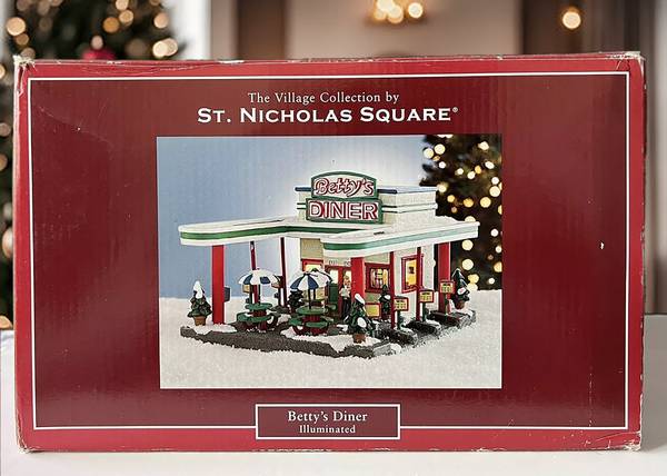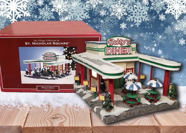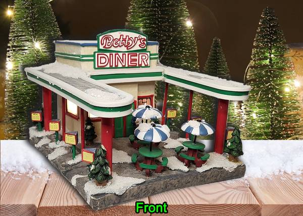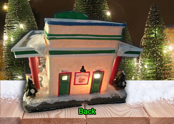Vintage retro-style diner with lights and drive-in service from the "St. Nicholas Square 2008 Christmas Village" collection. For those unfamiliar with the St. Nicholas brand (especially their earlier year pieces like this), they are very solidly made with amazing quality, detail, and construction unlike many of the thinly constructed villages sold today that can often easily crack.