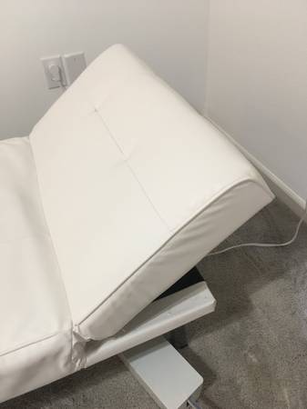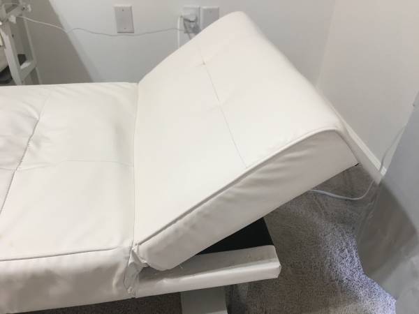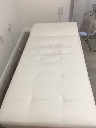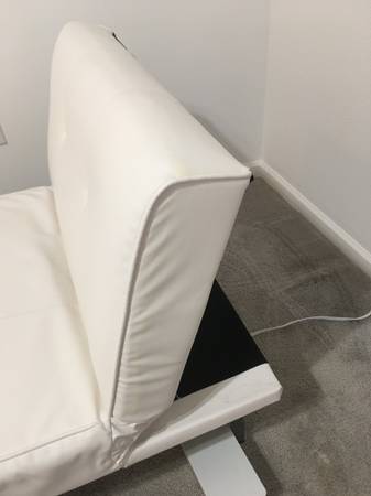 Beautiful Adjustable Back Chaise Lounge: 1. White Faux Leather. 2. With Adjustable Back. 3. Chrome Legs. 4. Light Weight. 5. For $120. or best fair offer. 6. Either with 8" Round Chrome legs for $80...