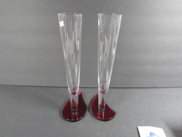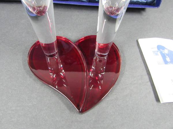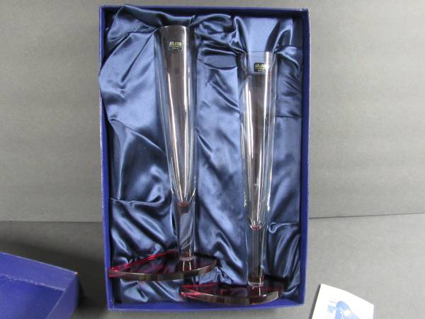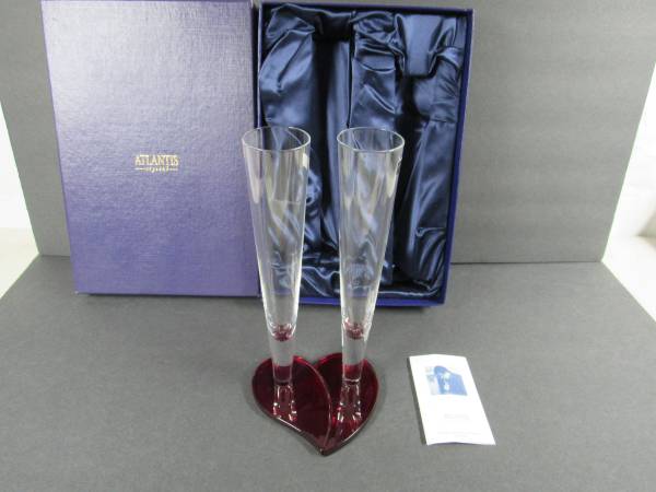 The Champagne glasses are 9 7/8"" tall X 1 3/4" diameter at the opening at the top, and made of crystal. No sure if ever used. Very good condition. Box has some minor storage wear. No broken or...