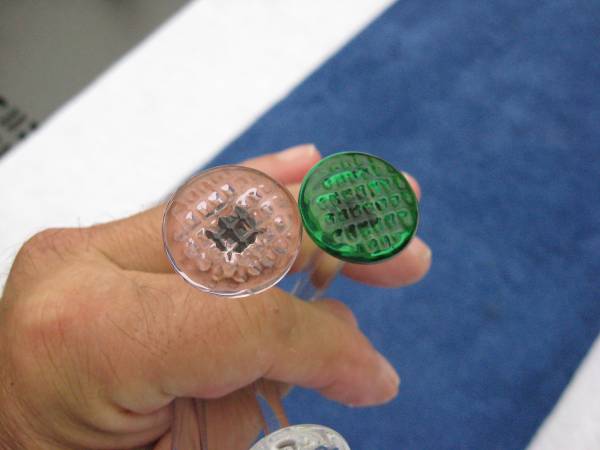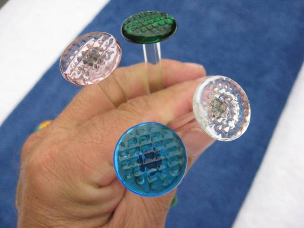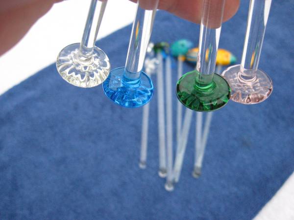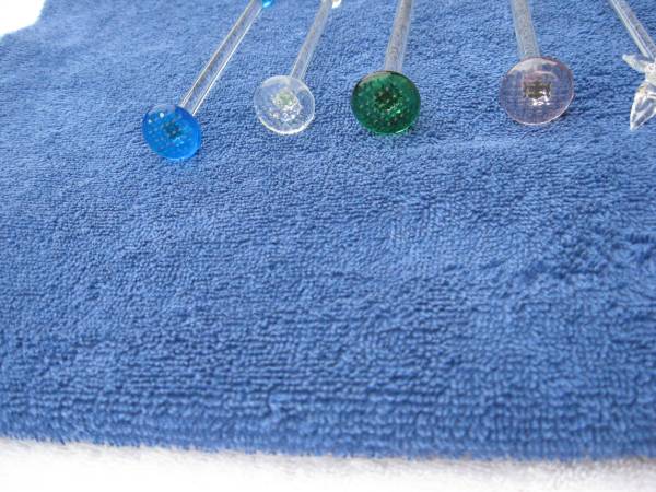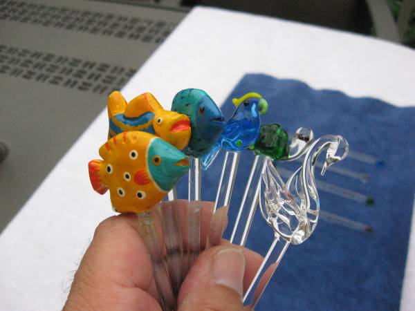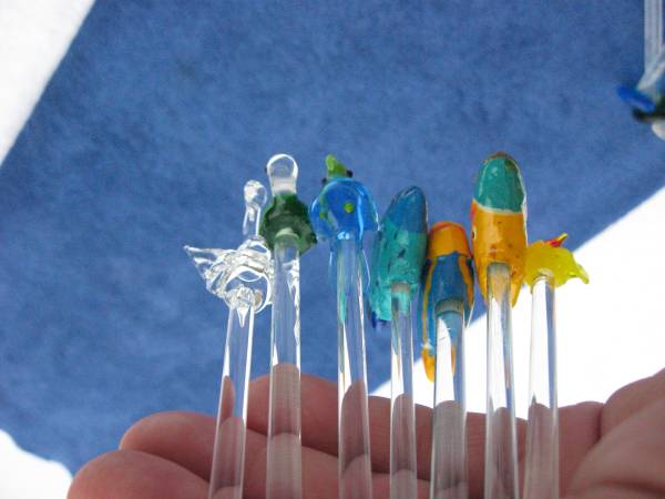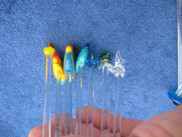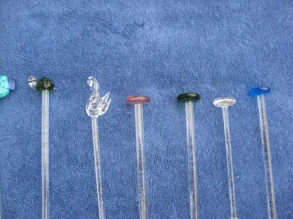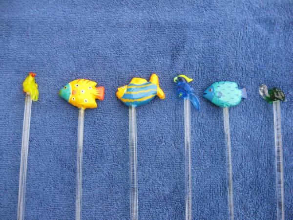 The glass swizzle sticks are 4 3/4" up to 8" length. The fish part of the stirrers are made of an epoxy type of material, and the others are made of all glass. Good condition except for the turquoise colored fish which has a chip and a crack in the tail fin.