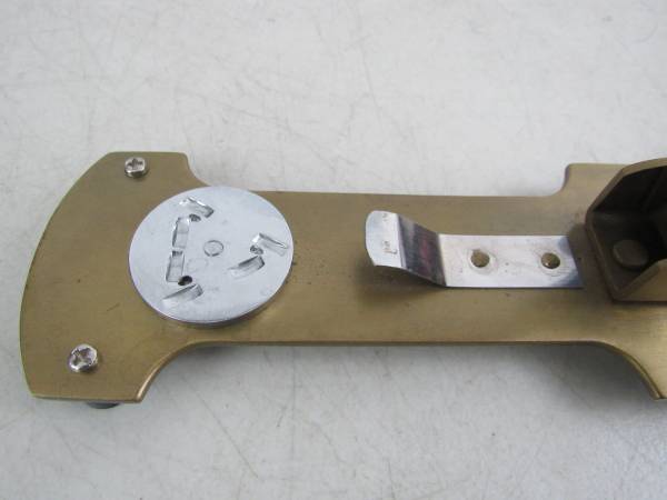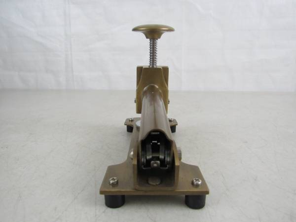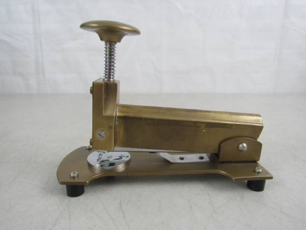 The stapler is 5 5/8" length X 4 1/4" height, and weighs 1 pound. Made of solid brass, steel, and the four feet are rubber. Good working and cosmetic condition with some minor age and usage wear....