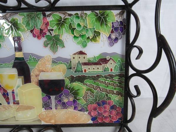 The serving tray frame dimensions are 20 1/8" X 12 7/8" X 4 1/8"., and the inside dimensions are 16" X 10'. Made of a steel or wrought iron frame and has an antique brass finish with a Tiffany style stained glass serving surface. Weighs 4 pounds 13 ounces empty. Very good condition. No broken or missing parts.
