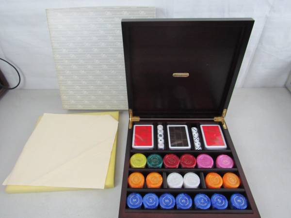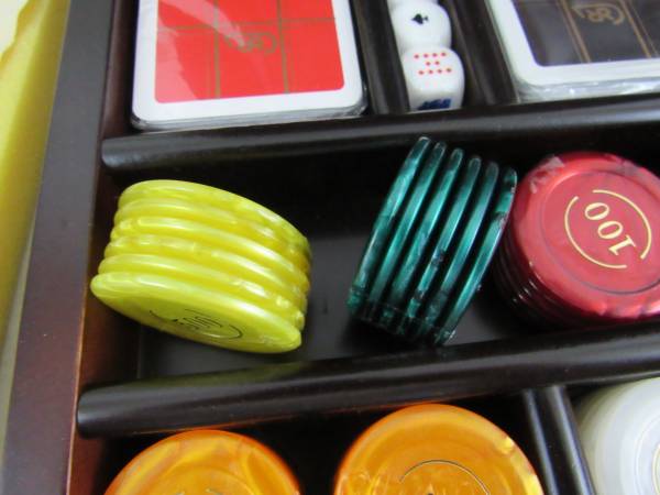The set has never been used. All parts are sealed. One deck of cards has the plastic wrap coming loose. The box is 11 3/4" X 11 3/4" 2 1/4"There is a small chips in the wood at the backside hinges. Minor storage wear to the card board box.