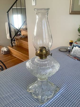 Nice Vintage Clear Pressed Glass Oil Lamp with Chimney. Height: 18”, Bowl Diameter: 7-1/2”. Excellent condition, ready for new wick and oil.