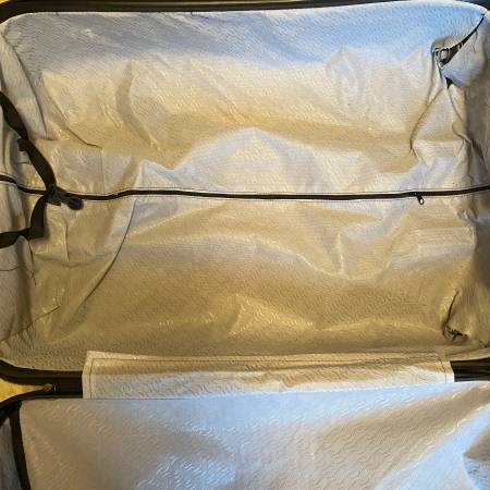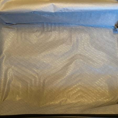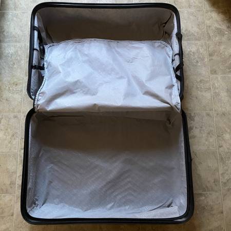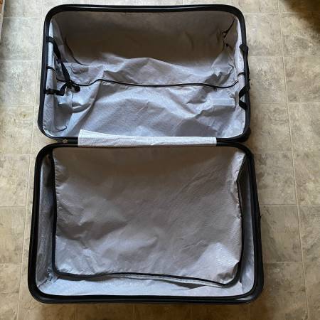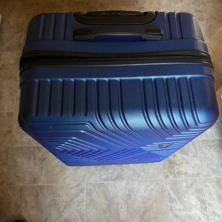 This blue hard shell suitcase with wheels is on sale. The wheels, pull out handle, and zipper work fine. However, there is a tear above the zipper on the top and the lock still needs to be tested....