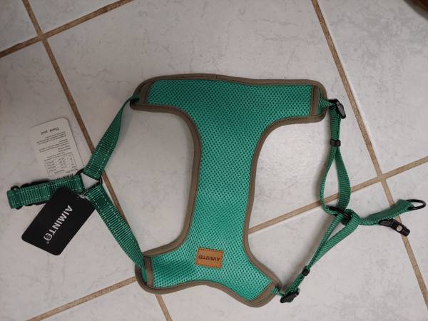 NEW - Step in Dog Harness, Medium, Teal - Adjustable Harness with Padded Mesh Fabric and Reflective Trim - Buckle Strap Harness for Dogs. Material: Nylon. *soft dog harnesses feature all-weather and fast-drying padded mesh fabric that ensures your furry friend stays comfortable during walks, runs, and outdoor adventures. *Equipped with a strong hook and loop closure, quick-release buckle strap, and double D-rings, this no escape dog harness is designed to provide maximum security and control. *dog body harness is built to withstand daily wear and tear, providing your pet with long-lasting comfort and security. This harness is for a CHEST GIRTH of 19 to 28 inches. Come and get it. I only accept cash and thanks for looking.