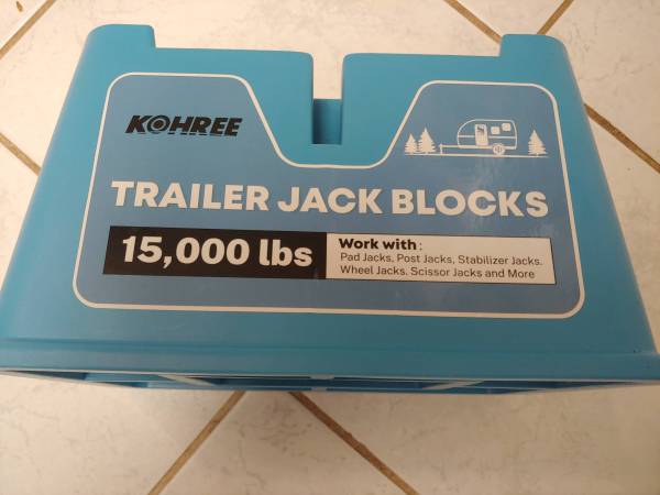 New - Kohree Trailer Jack Block, Up to 15,000 lbs, Sturdy RV & Camper Leveling Blocks for Travel Trailer 5th Wheels and More, Use for Any Tongue Jack, Foot, Post, or Stabilizer, RV Accessories. *Built with a high-performance polymer. To meet the load-bearing needs of the trailer, we have upgraded the internal structure. It is extreme and sturdy - up to 15,000 lbs. The professional block designed for motorhomes and trailers is much better than wood blocks or other blocks. *The top of the block is designed with grooves to enhance stability during stacking use. Side hole design for easy carrying. Come and get it. I only accept cash and thanks for looking.