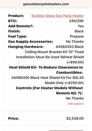 SunStar Glass Patio / Porch heater w/Fixed 10” mounting bracket and Heat Shield (2 heaters available) Gas Type - Propane All components are still in original box - purchased 2 months ago - too big...