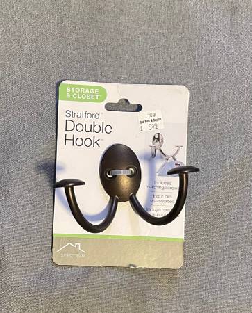 For sale. Spectrum Stratford Series Venetian Bronze Wall Mount Double Hook w/ screws. The hook is made of sturdy steel and has a bronze finish. $5.00 Cash only No e-payments Local pickup only No...