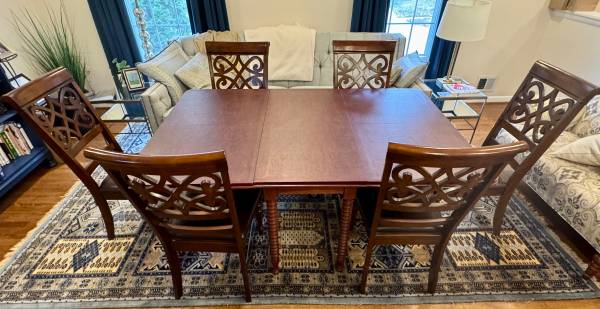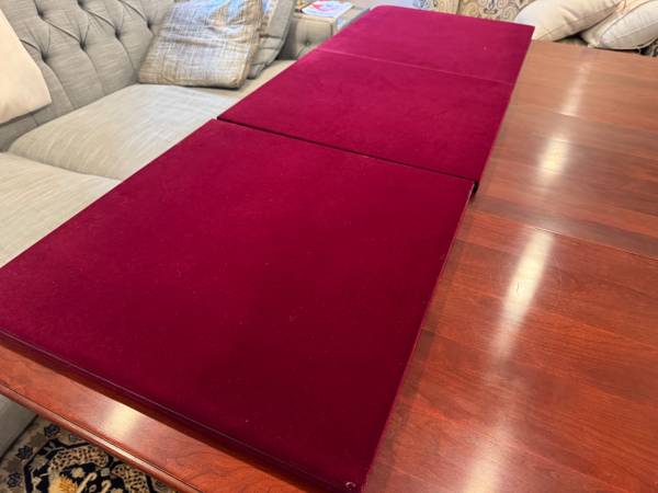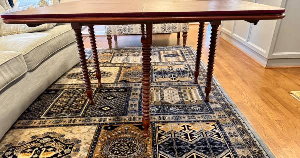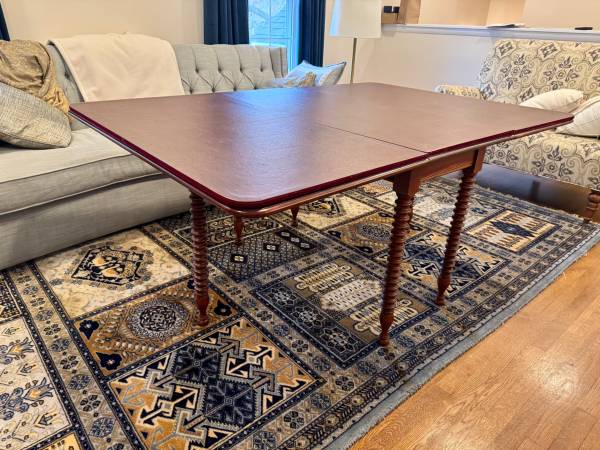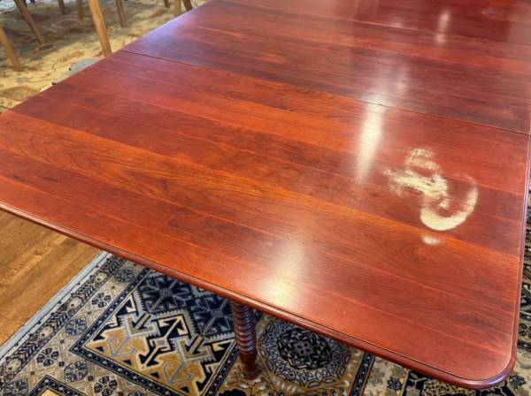 Antique cherry drop leaf wood console/dining table in good condition with one blemish on the wood table top. Gate legs on either side of the table fold inward to allow the leafs to close. Comes with felt backed table pads.